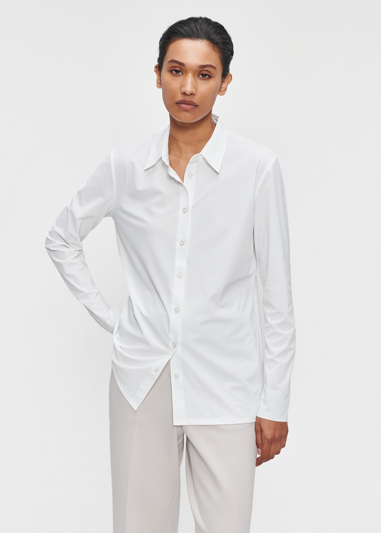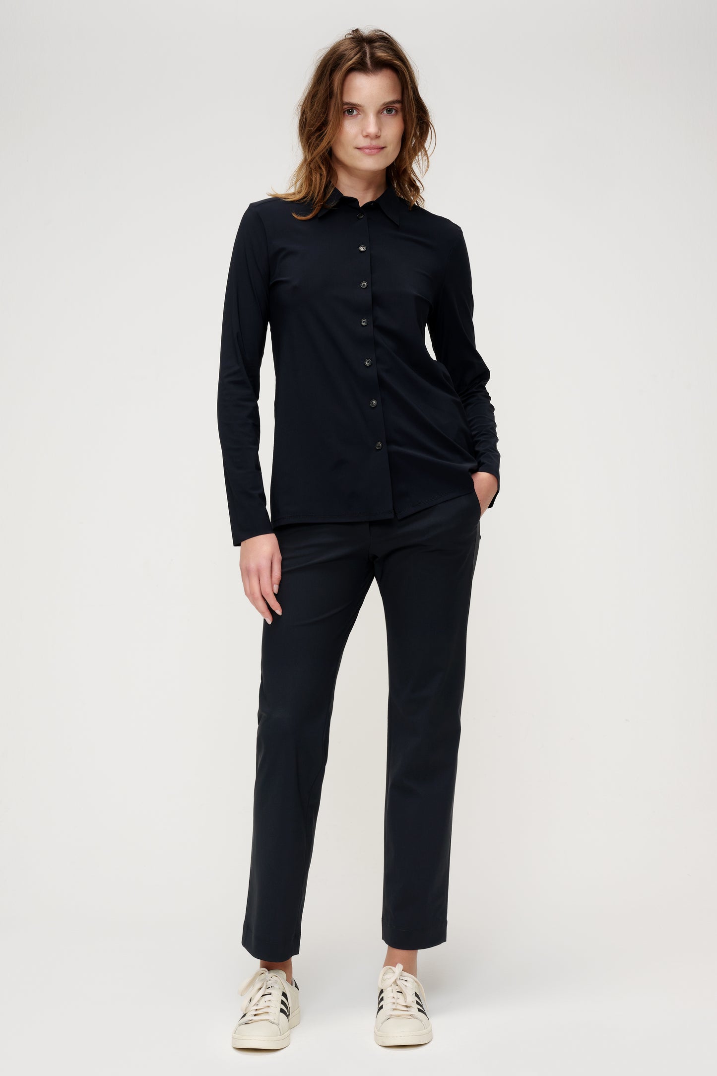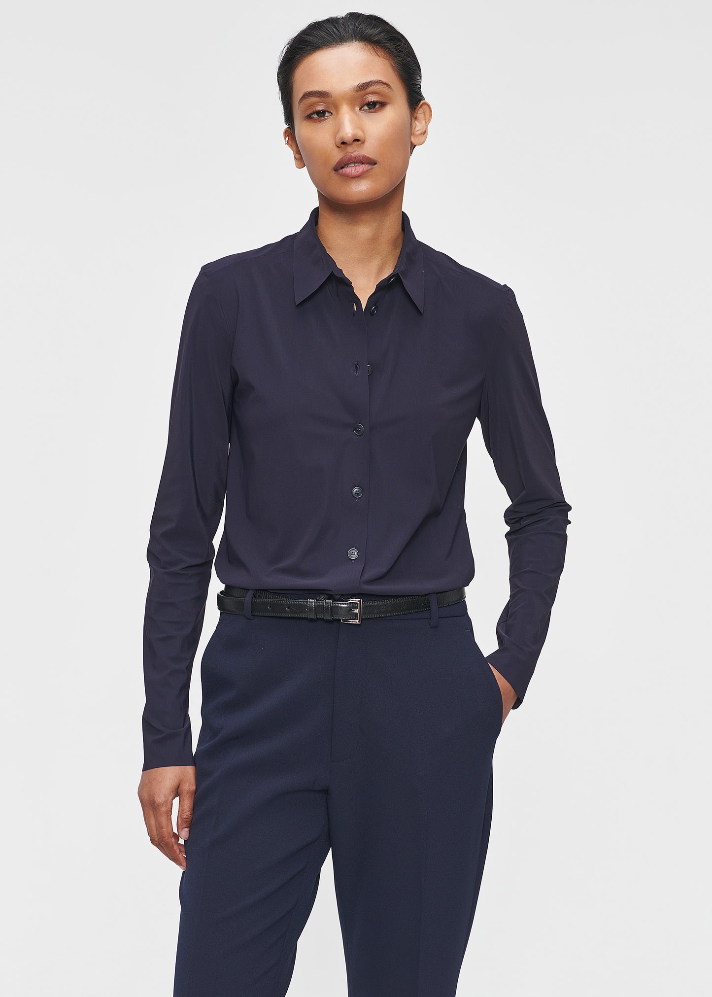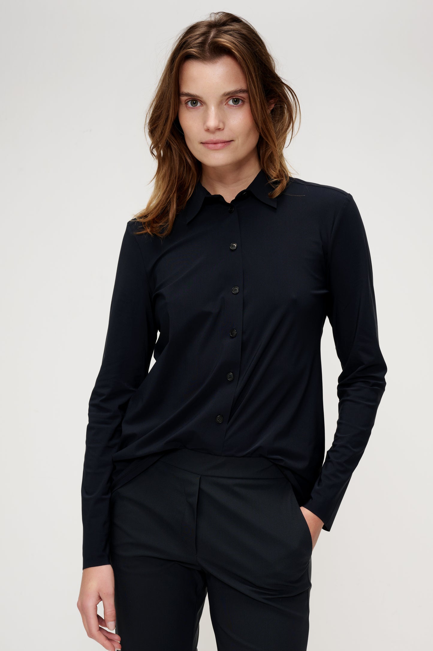 The TRVL DRSS Shirt is a need to have, as it is a comfortable and basic closet staple. It is the perfect basis for an easy everyday look as well as a smart business look. This perfect TRVL DRSS shirt has long sleeves, stand-up collar, and buttons on the front. This blouse is available in timeless off-white, black and ink blue.