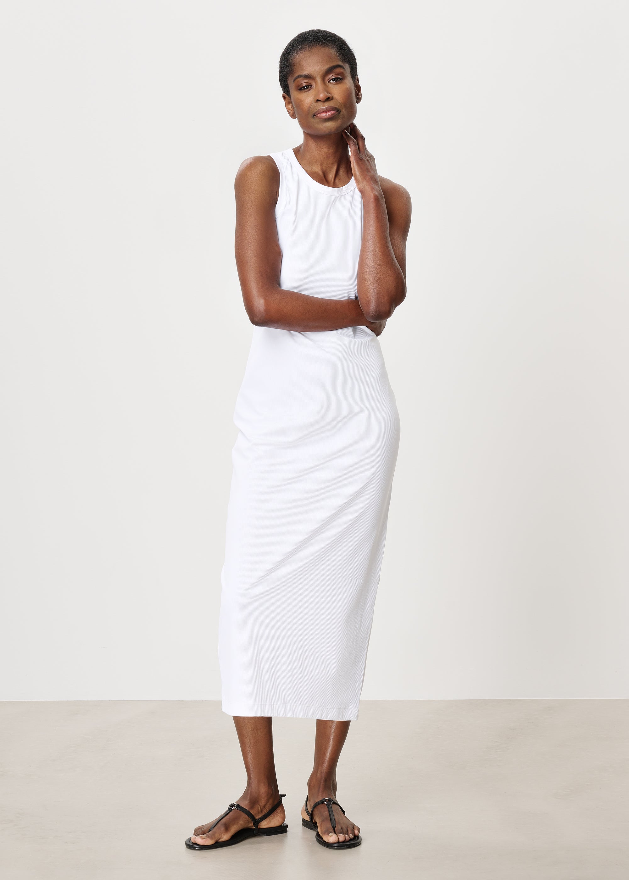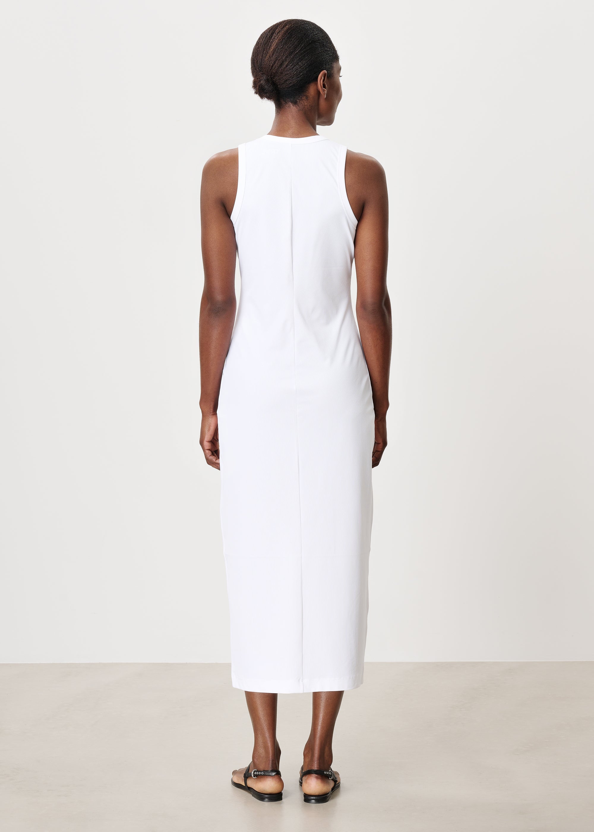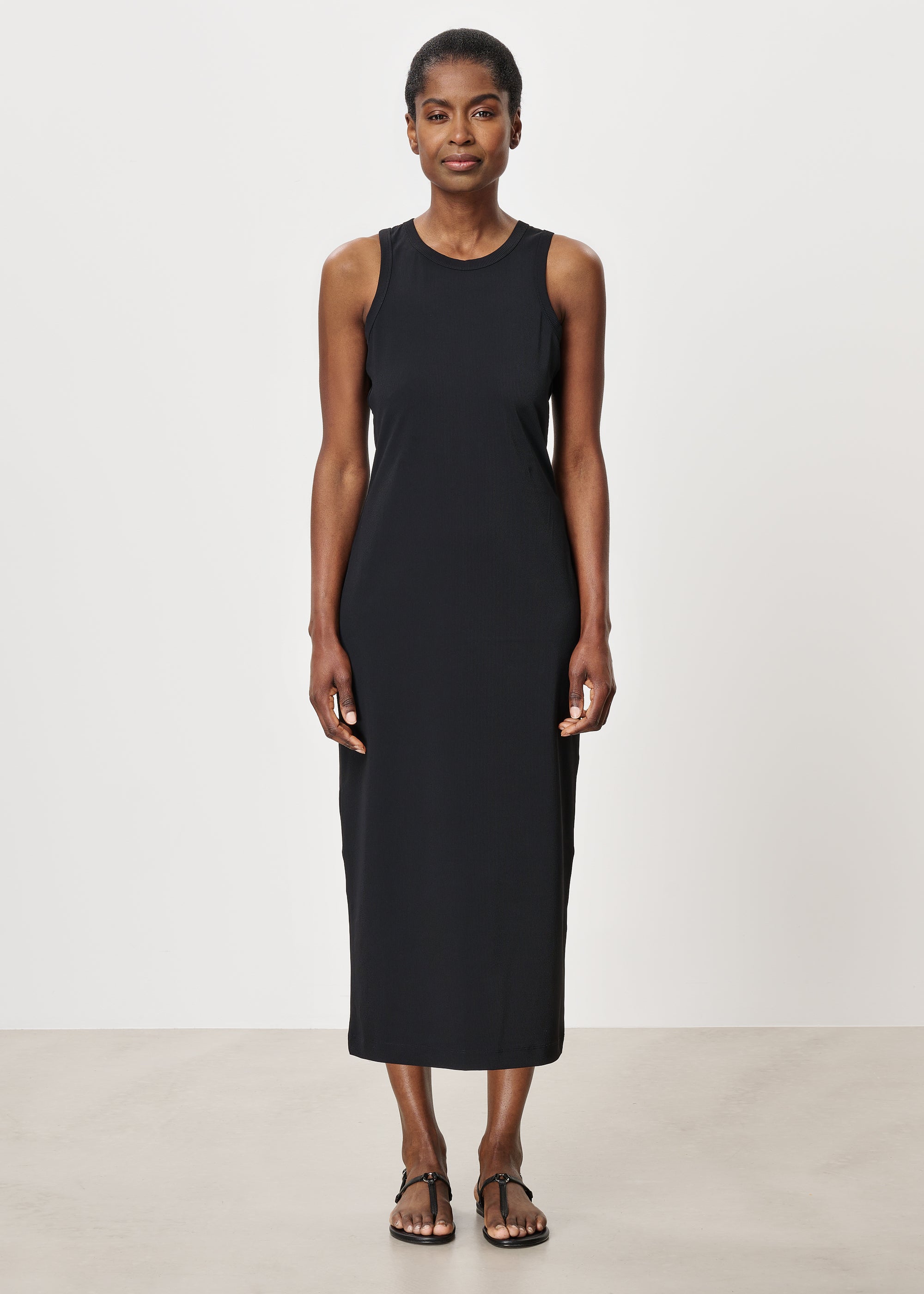 Sleeveless faux ribbed, body-hugging dress. Made in innovative Italian jersey.