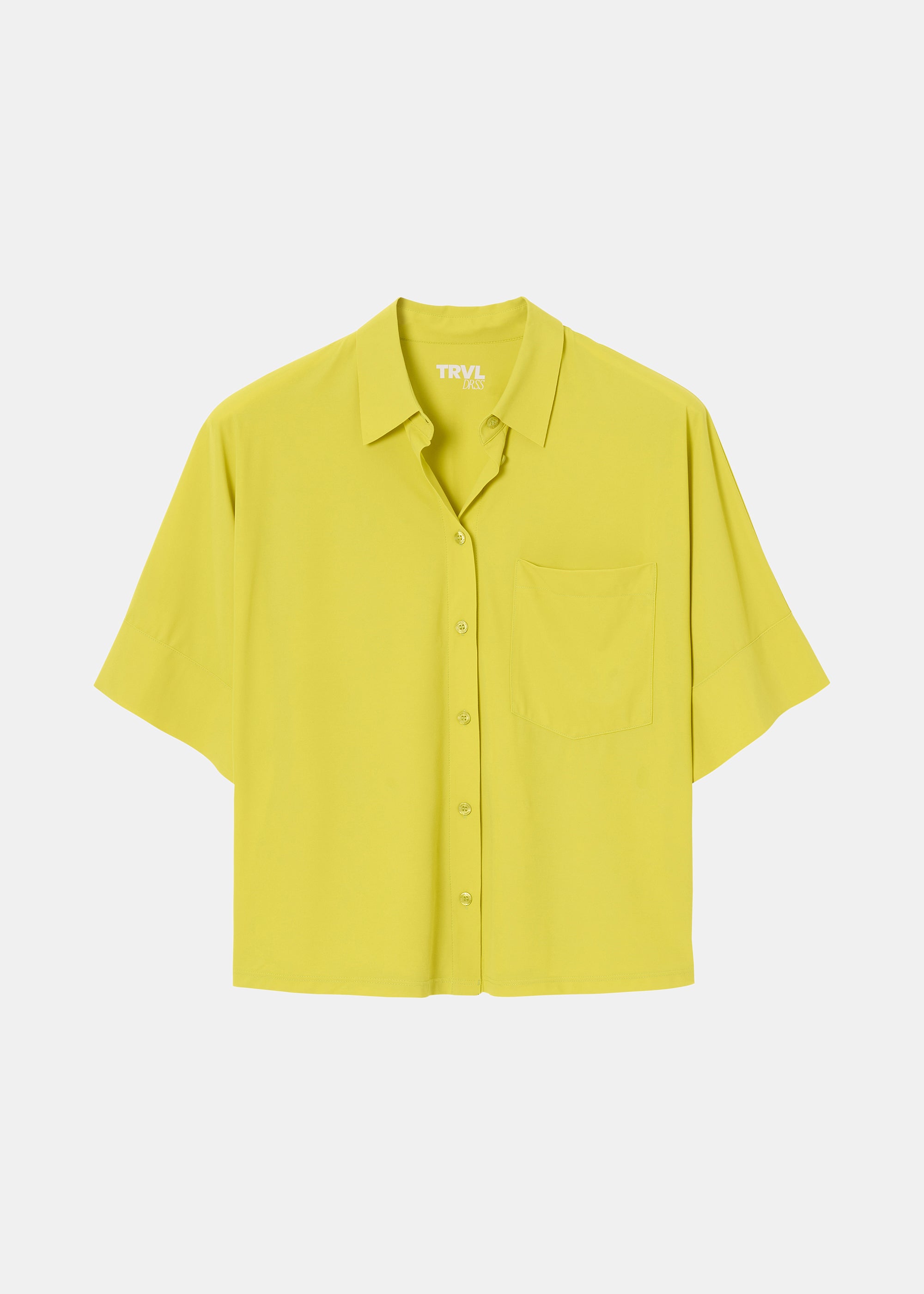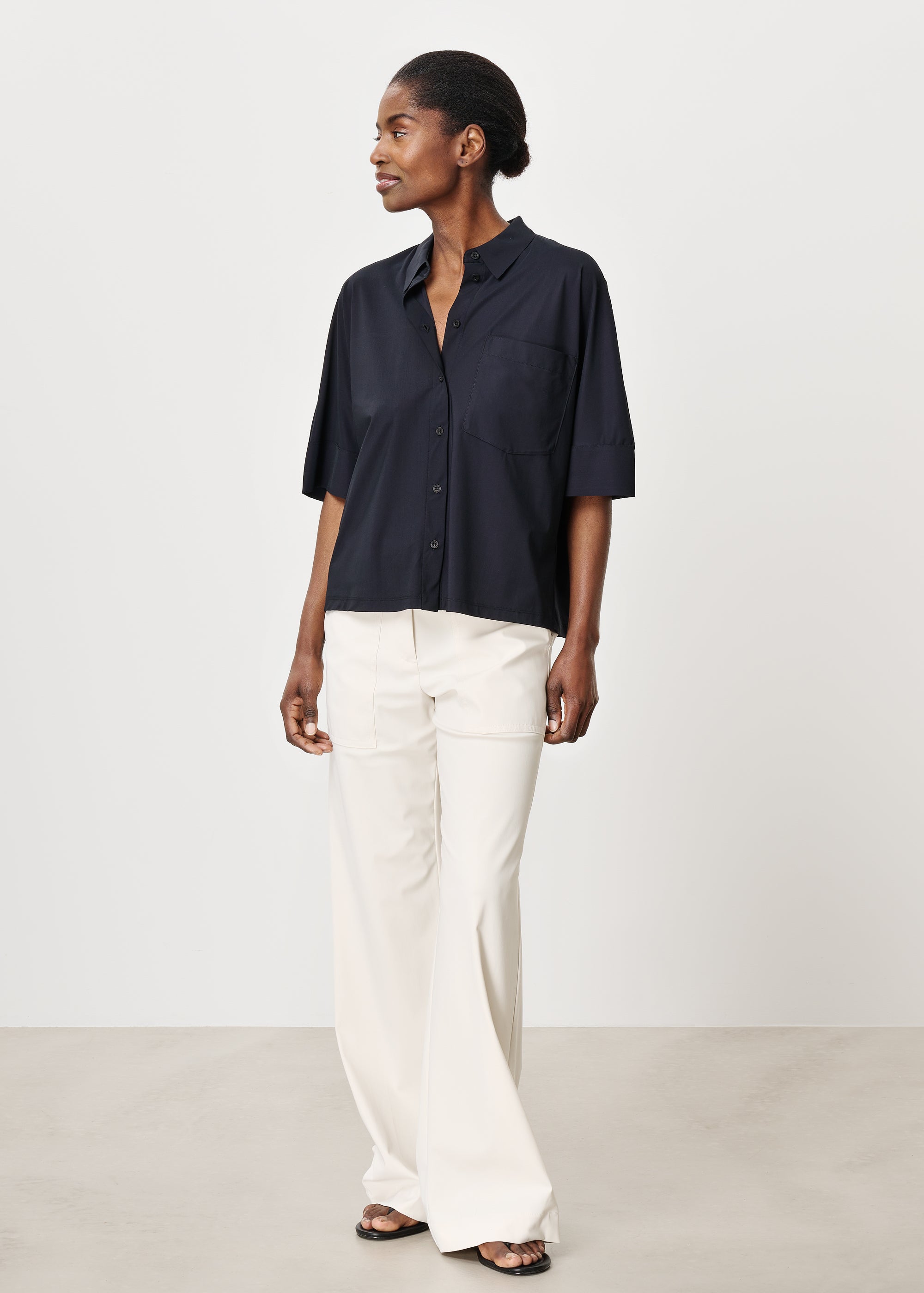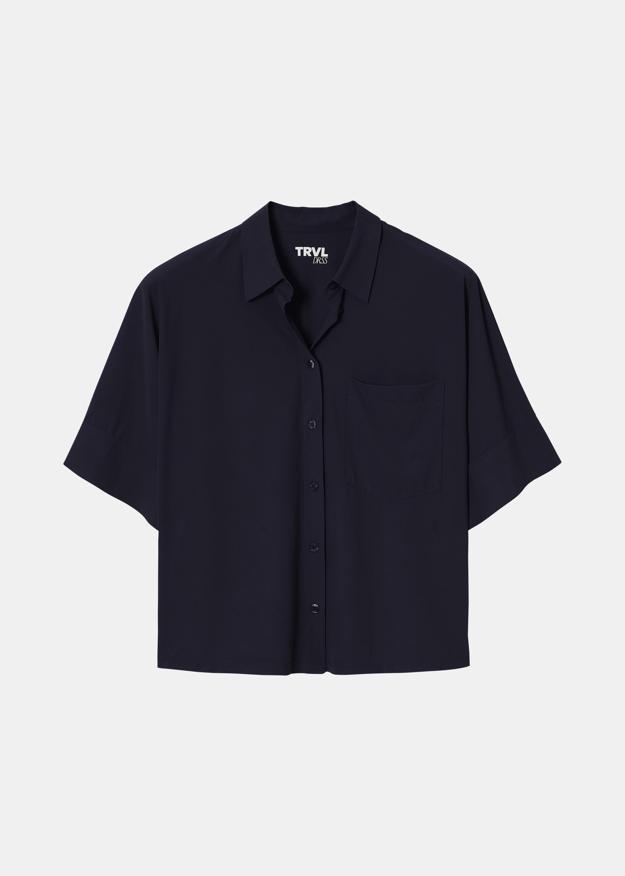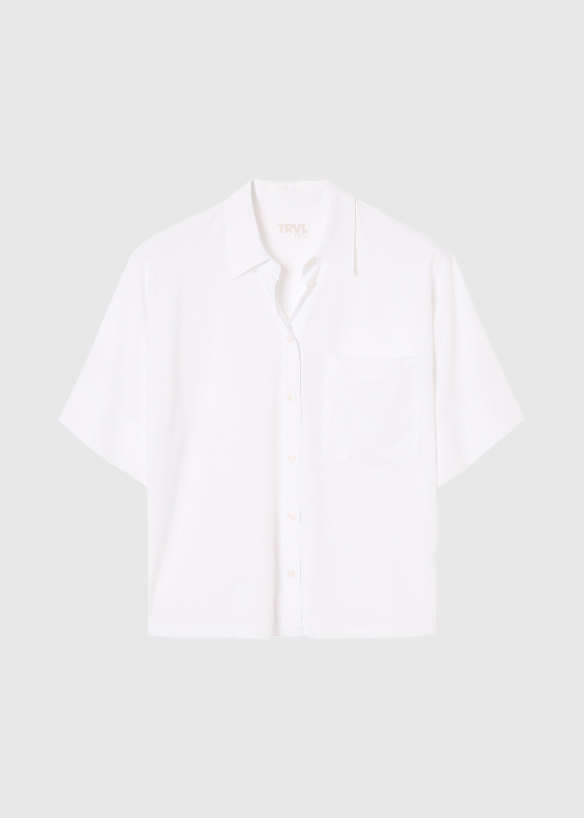 Een klassiek overhemd met een moderne twist en gemaakt van onze lichtgewicht Italiaanse TRVL Jersey. Het Amara Shirt heeft een klassieke kraag en knoopsluiting op het voorpand. Met opgestikte zak aan de voorkant en boxy silhouet. Opgerolde korte mouwen.