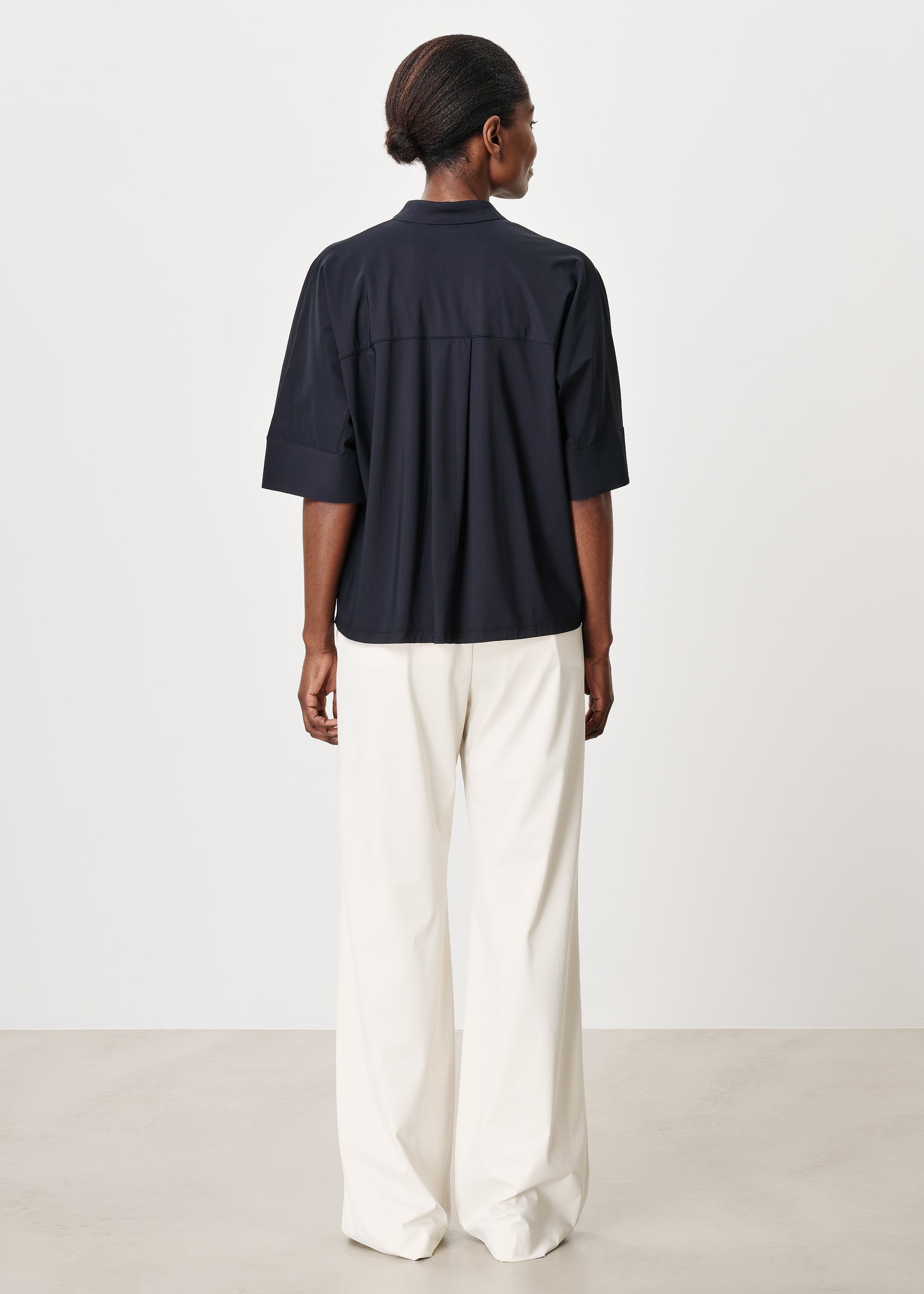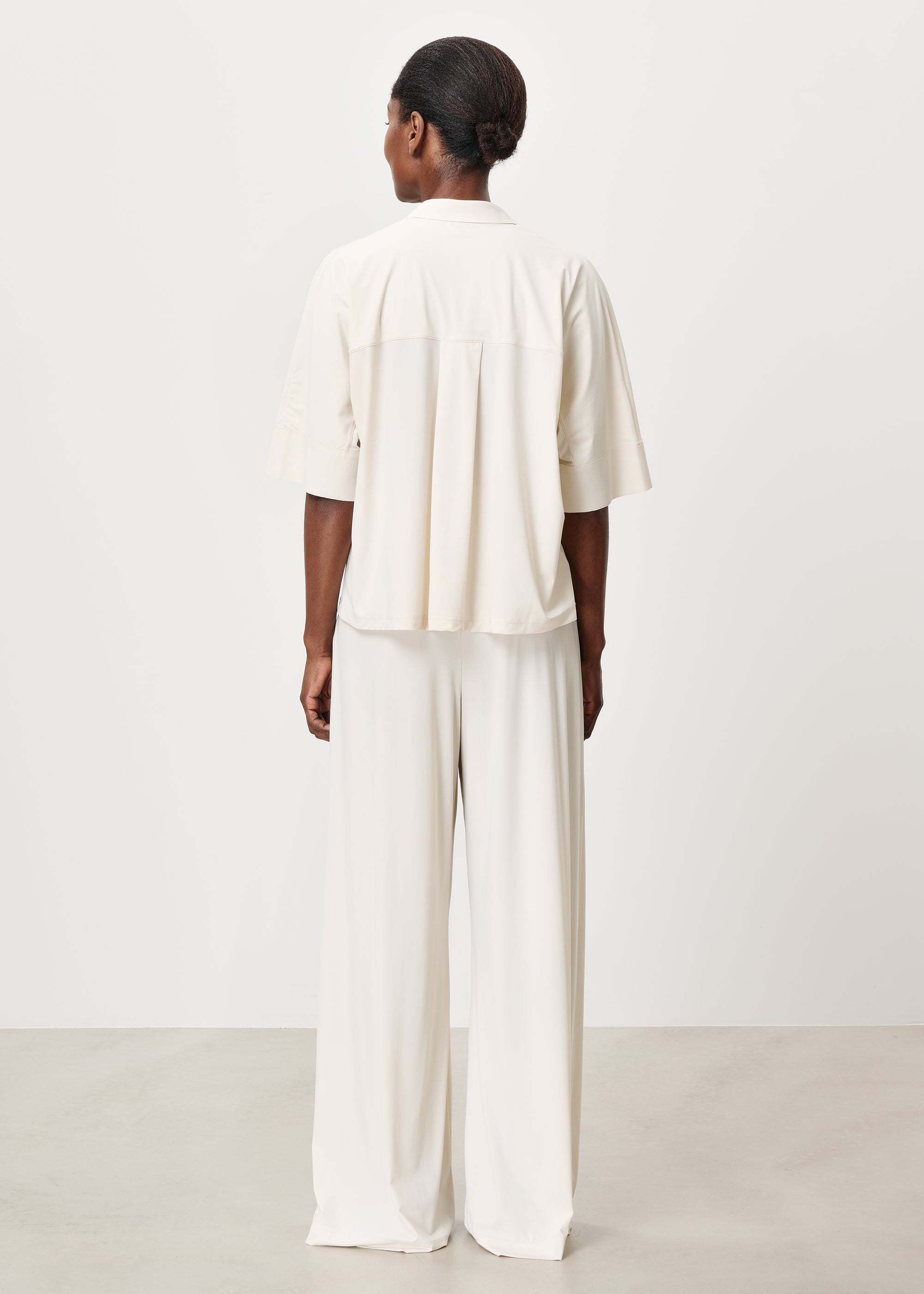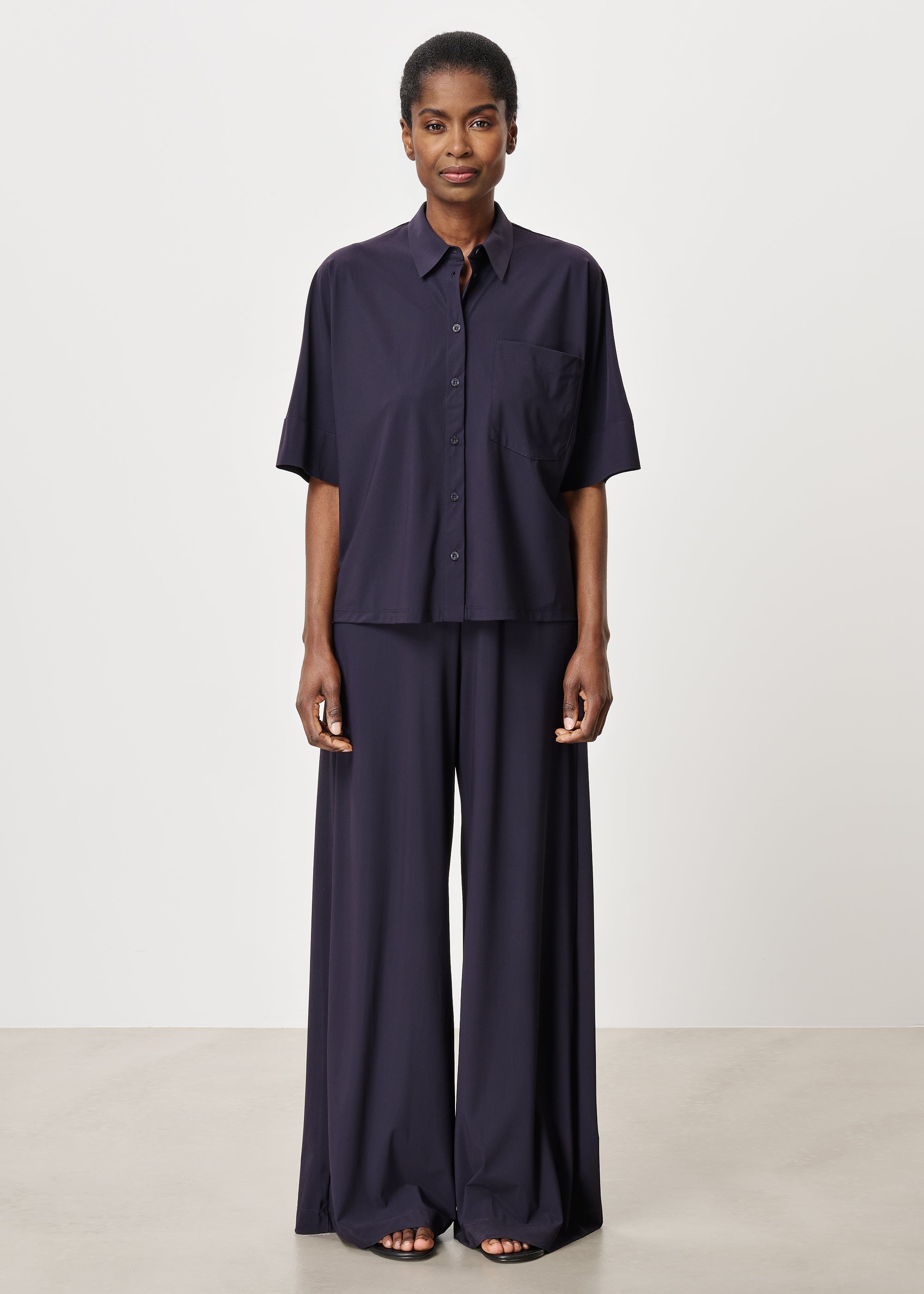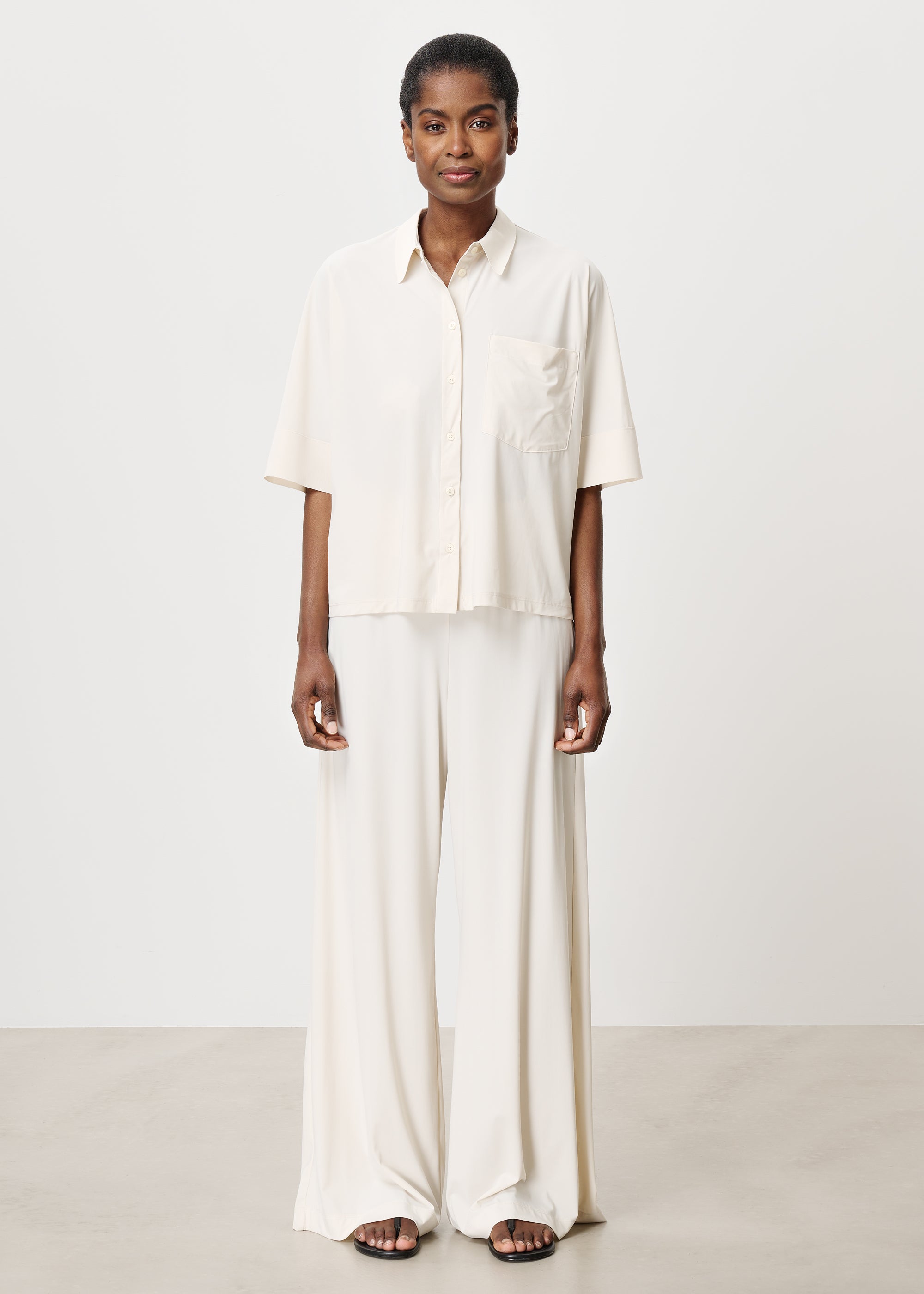 Een klassiek overhemd met een moderne twist en gemaakt van onze lichtgewicht Italiaanse TRVL Jersey. Het Amara Shirt heeft een klassieke kraag en knoopsluiting op het voorpand. Met opgestikte zak aan de voorkant en boxy silhouet. Opgerolde korte mouwen.