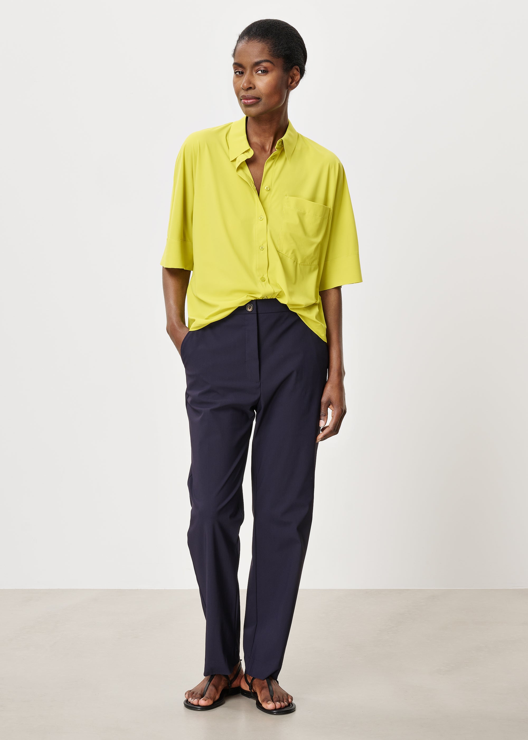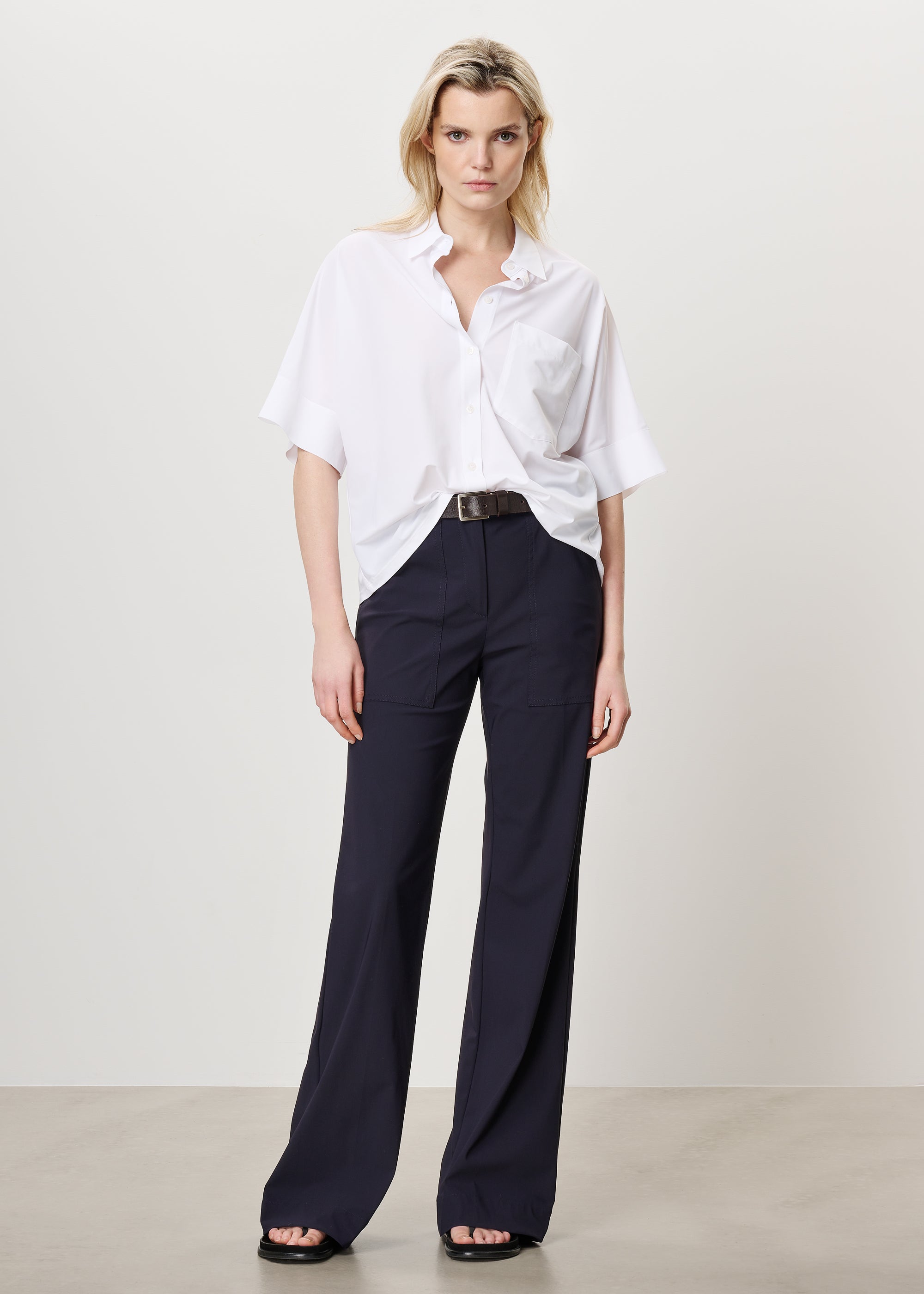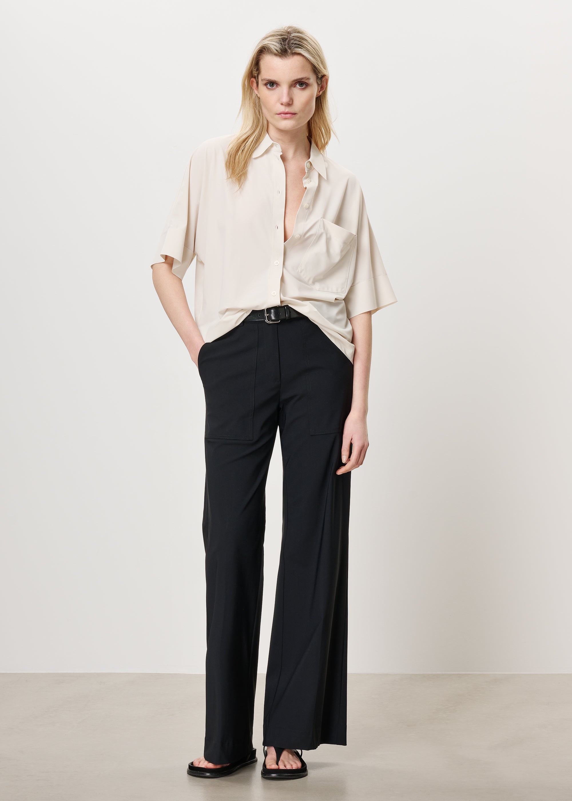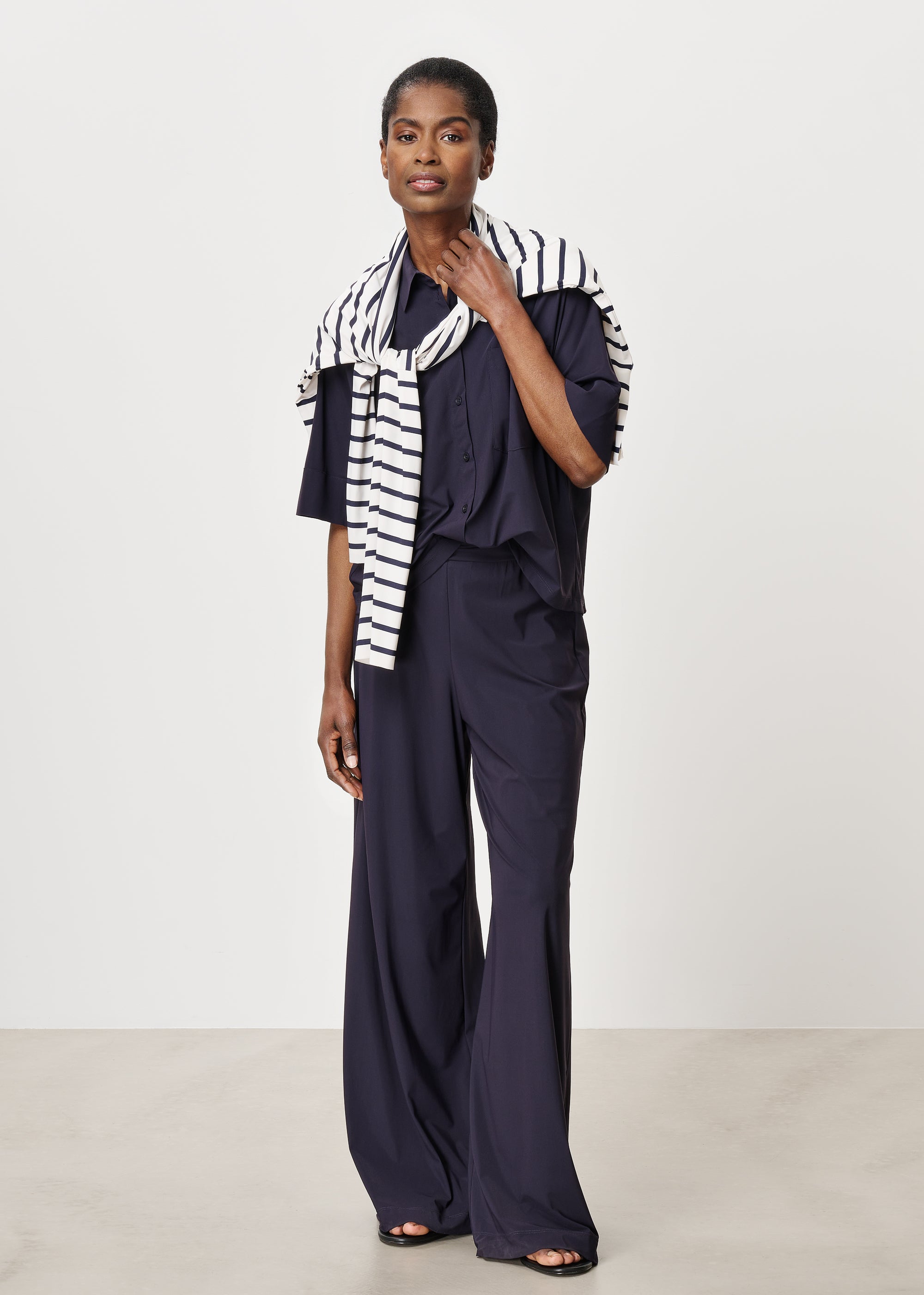 Een klassiek overhemd met een moderne twist en gemaakt van onze lichtgewicht Italiaanse TRVL Jersey. Het Amara Shirt heeft een klassieke kraag en knoopsluiting op het voorpand. Met opgestikte zak aan de voorkant en boxy silhouet. Opgerolde korte mouwen.