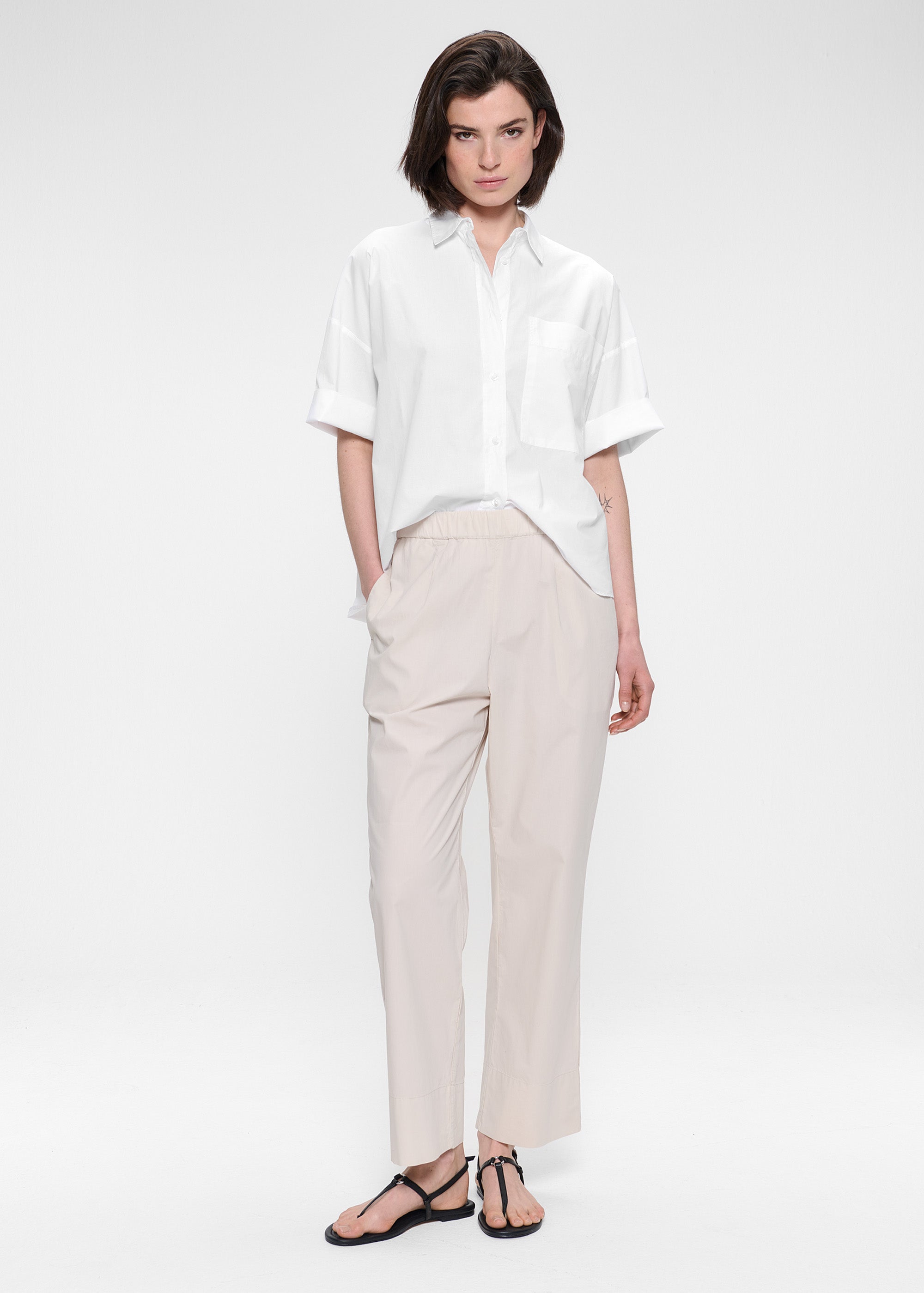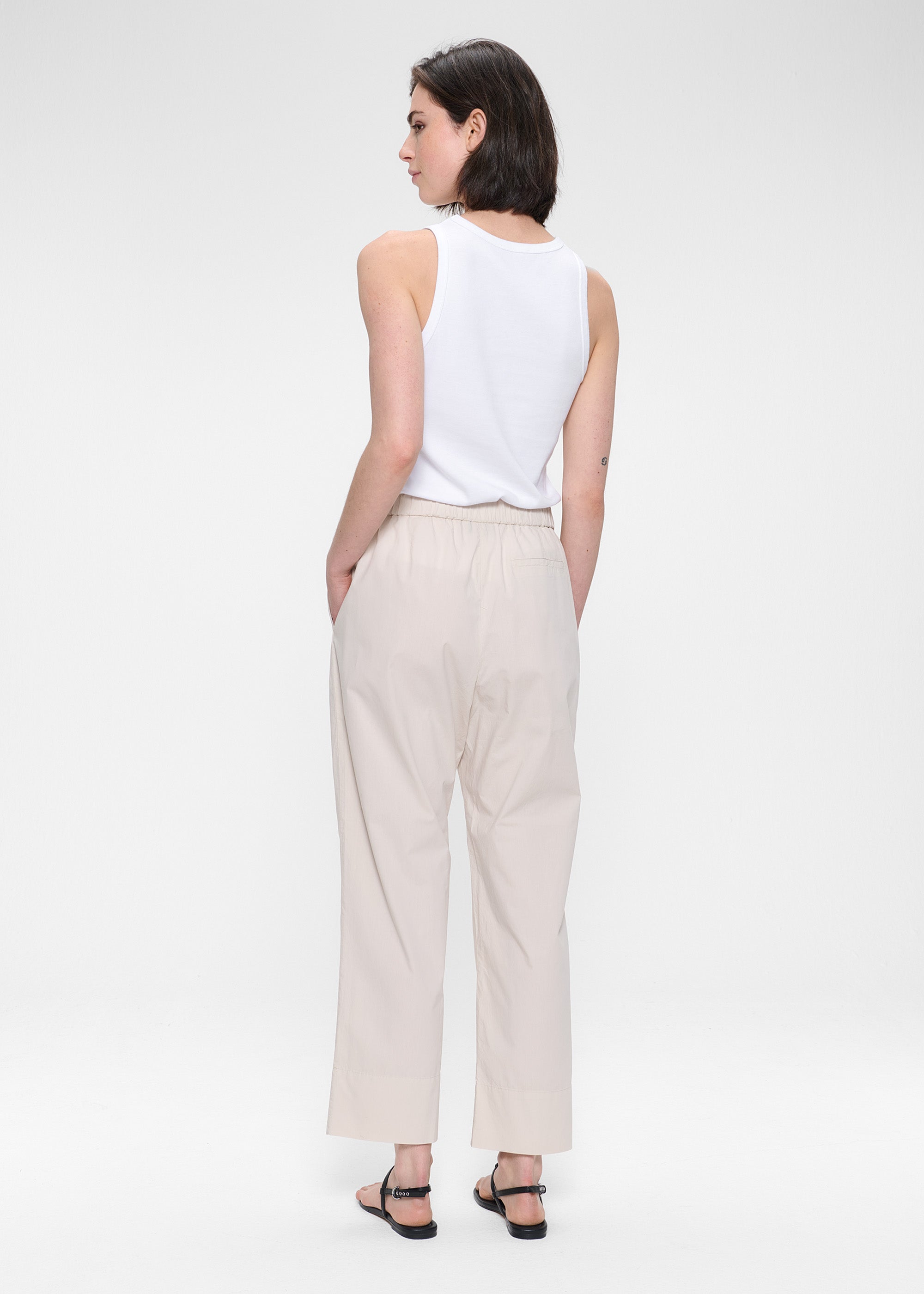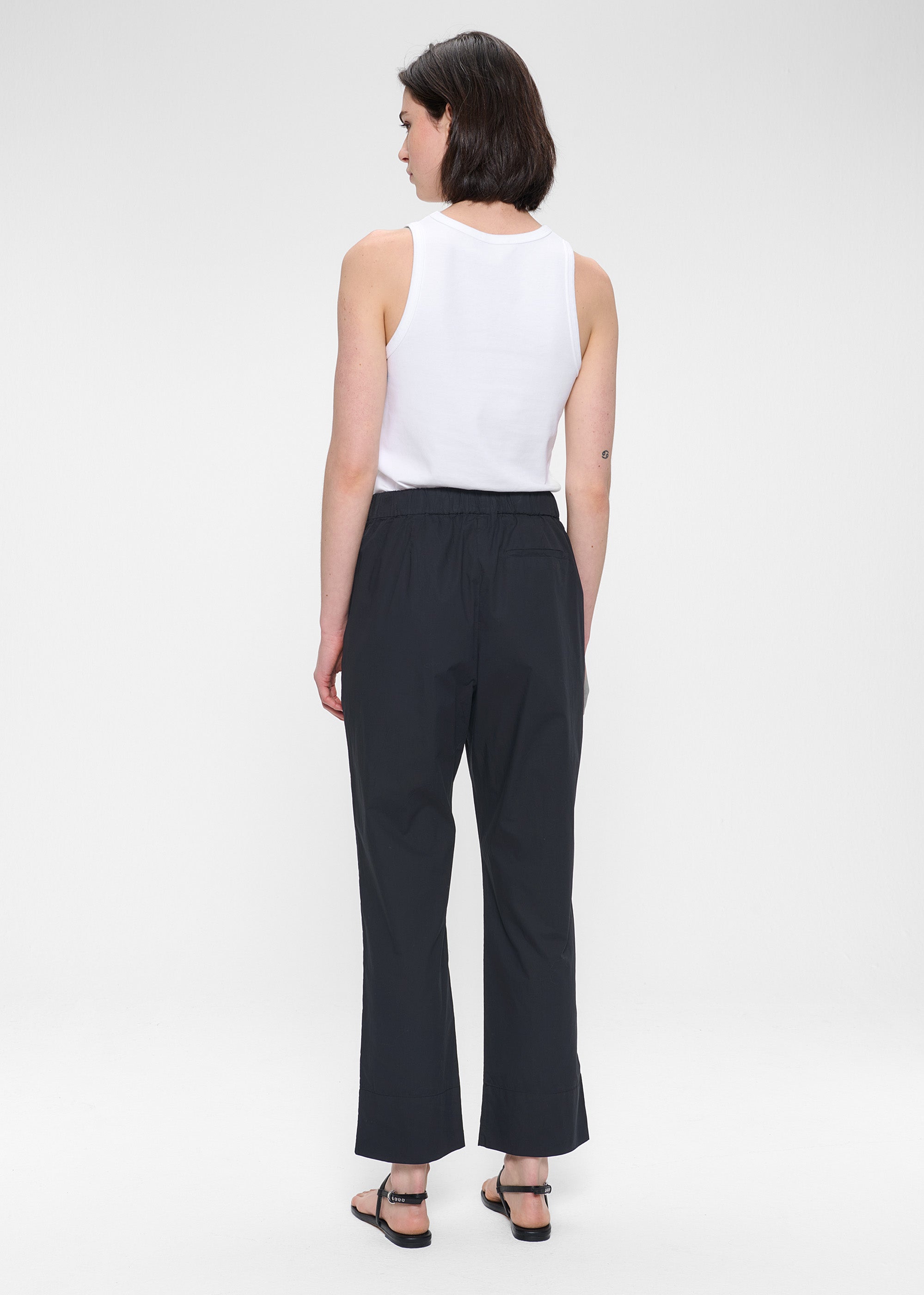 Notre favori intemporel est le pantalon Sydney. Il présente une coupe boyfriend, une ceinture élastique et des poches invisibles dans les coutures latérales. Plis sur le devant et longueur légèrement raccourcie à la cheville.