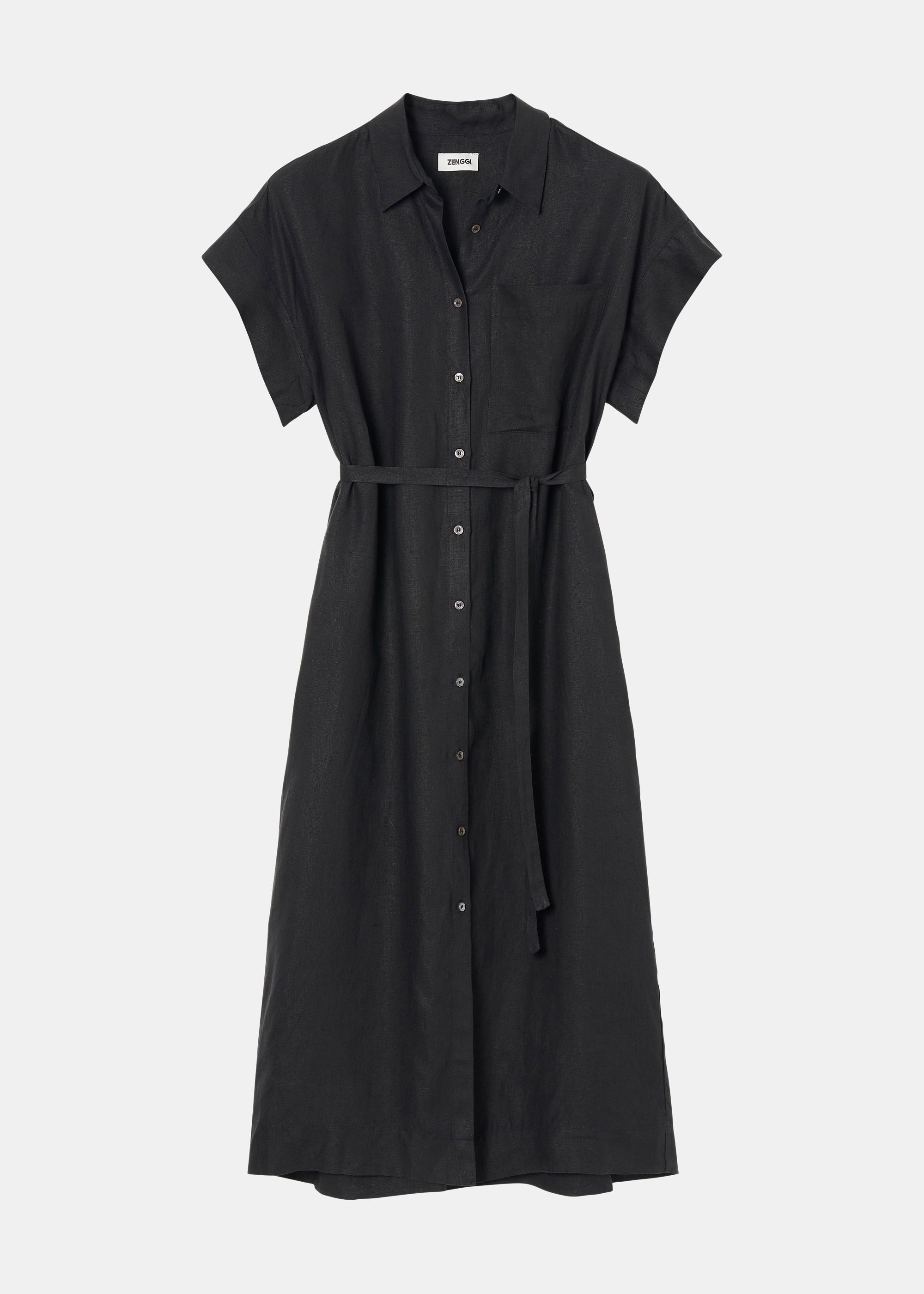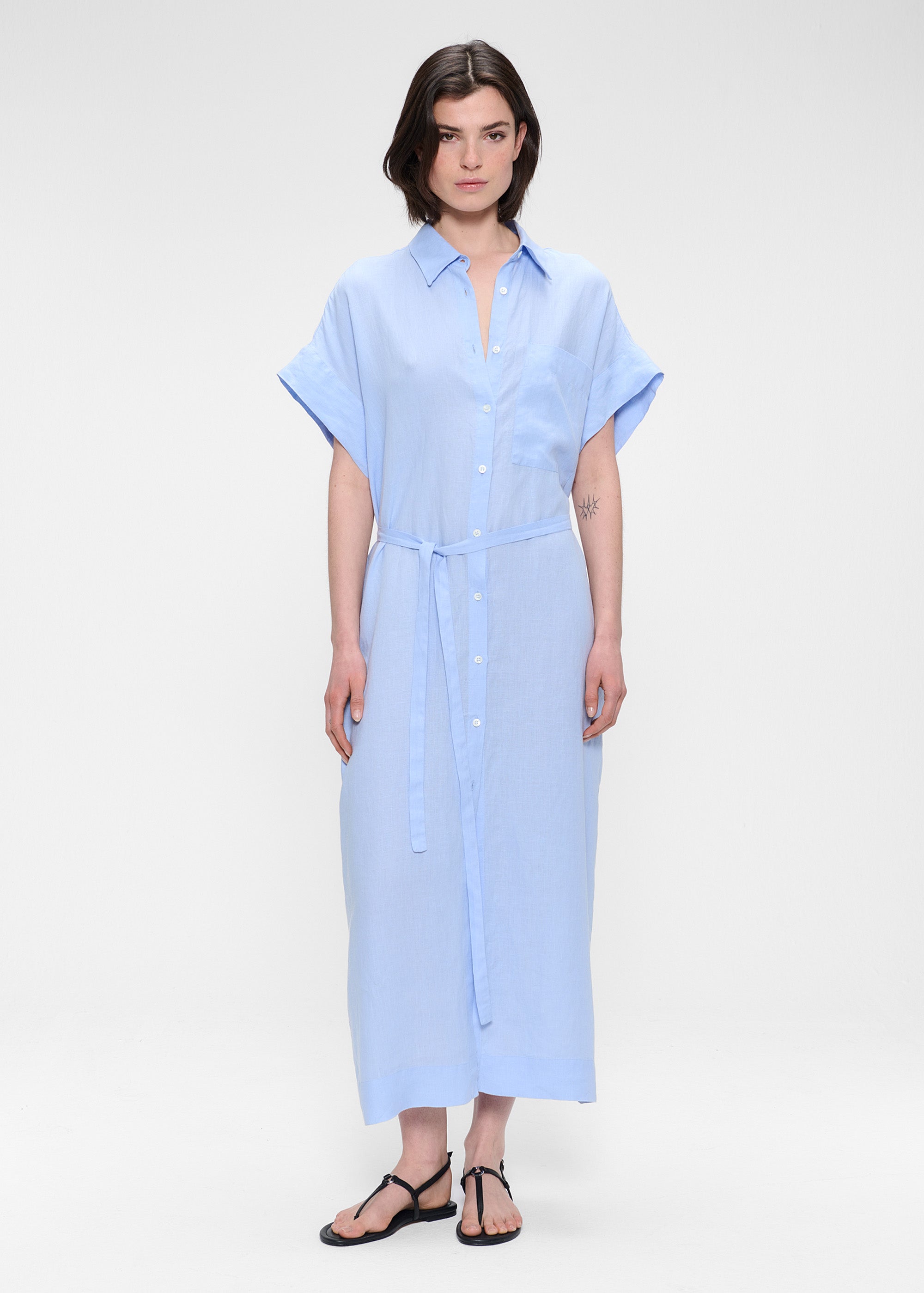 Réalisée en lin européen doux et délavé, cette robe-chemise présente une silhouette droite. Cette robe est dotée d'un col classique et d'une poche plaquée sur le devant. Poches dissimulées et ceinture à nouer assortie pour souligner la taille. Portez-la comme une robe ou combinez-la avec le pantalon Sophie pour un look d'été cool.