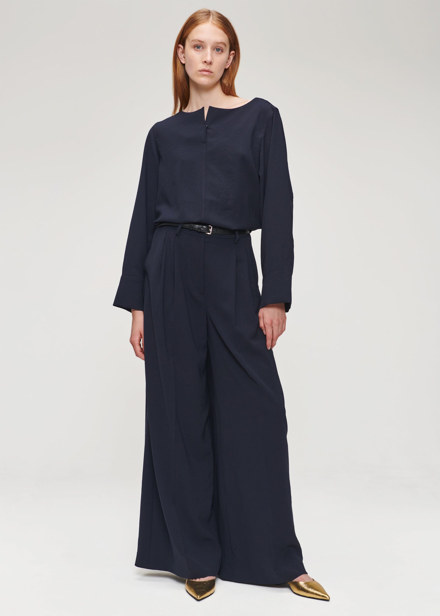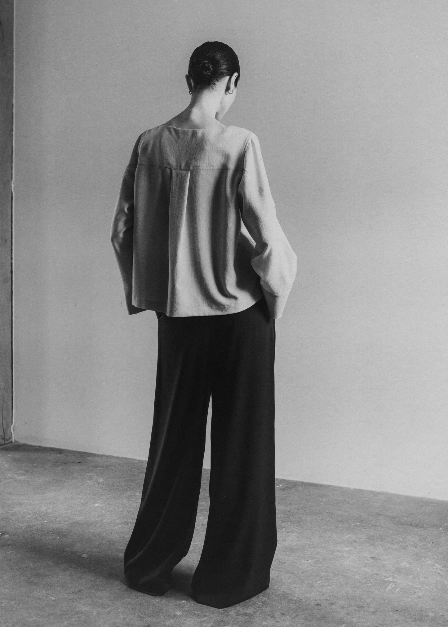 The ZENGGI Japanese Crêpe Top is a sophisticated and versatile garment that embodies the elegance and texture of Japanese crêpe fabric. Available in Greige, Midnight Blue and Dark Green.